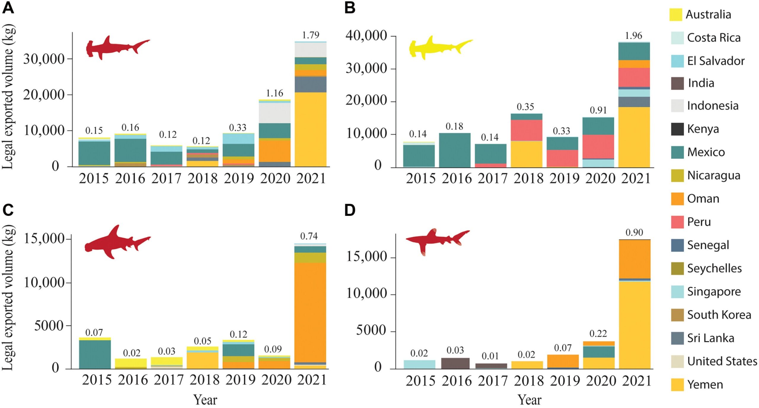 Однак дослідники відзначили, що «існує величезна прірва між тим, що написано на папері, і тим, що відбувається в реальному світі». Включення цих видів до Додатку II CITES дозволяє торгівлю, лише якщо вона є законною, простежуваною та стійкою. Однак більшість – 81% – країн, які експортують акулячі плавники, ніколи не повідомляли про торгівлю цим видом, що вказує на постійний незаконний експорт.